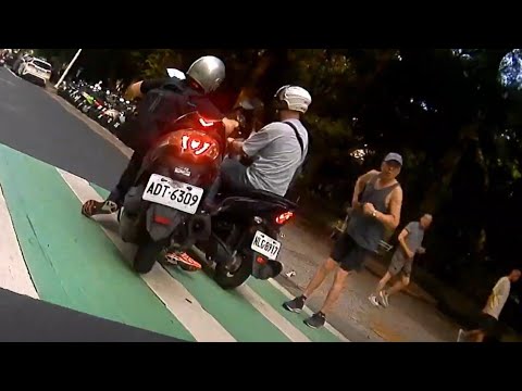 到底有沒有在看路?一名騎士日前上午7時許騎車行經新北市中和區安平路時,因一名阿伯站在公園旁斑馬線上等待過馬路,於是他便「急煞車」禮讓,沒想到,後方來車疑似未注意前方狀況,直接撞上去,還擦撞其它的機車,一旁等紅燈及正在運動的阿伯們,看到都急忙退後閃避。